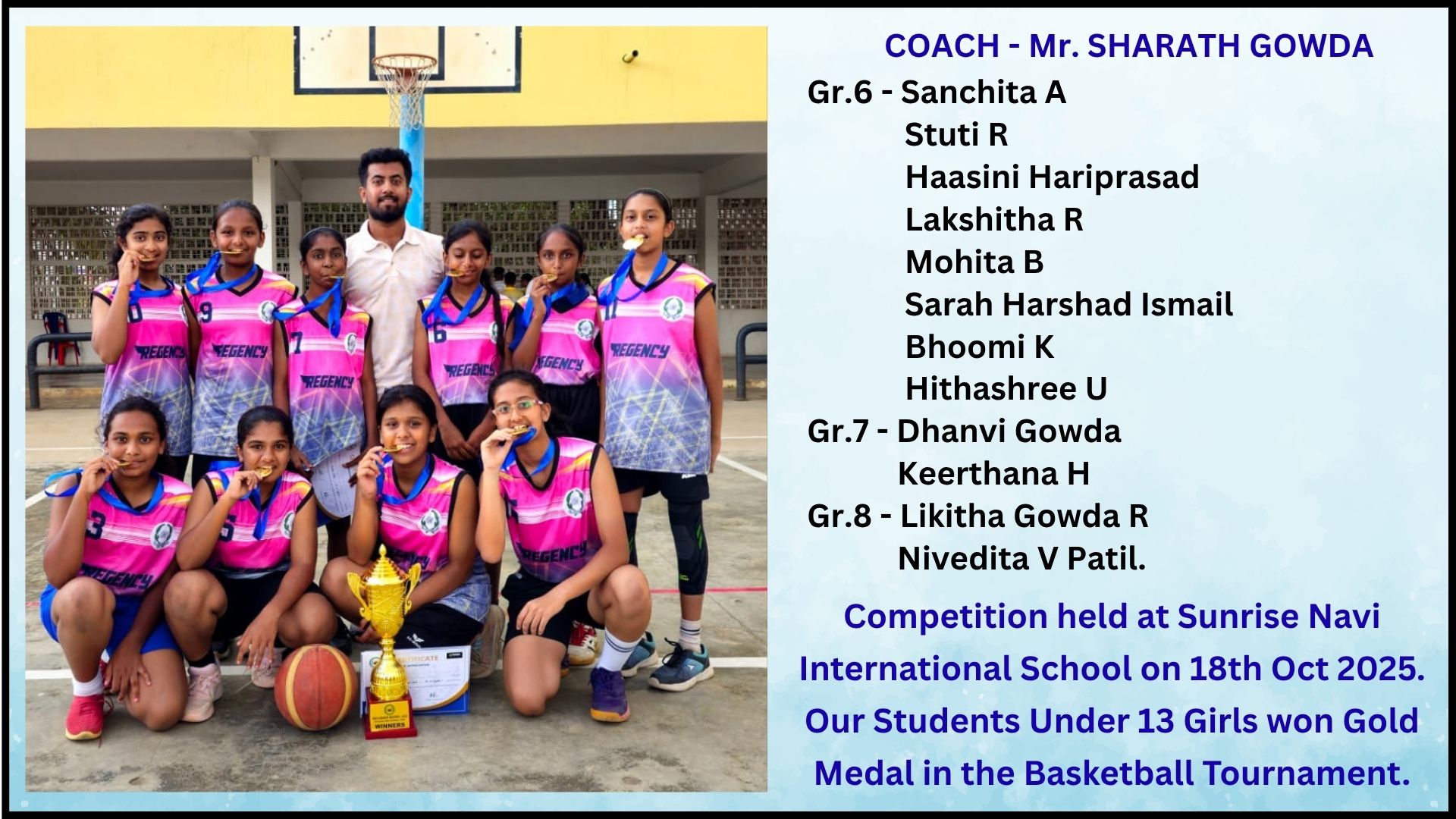 Our Students Under 13 Girls won Gold Medal in the Basketball Tournament Competition held at Sunrise Navi International School on 18th Oct 2025.