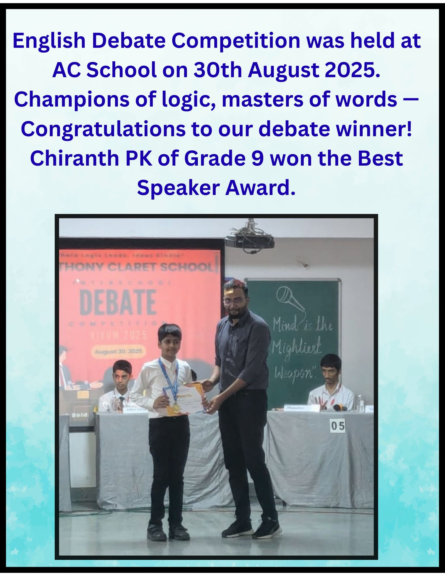 English Debate Competition was held at AC School on 30th August 2025. Champions of logic, masters of words — Congratulations to our debate winner! Chiranth PK of Grade 9 won the Best Speaker Award .