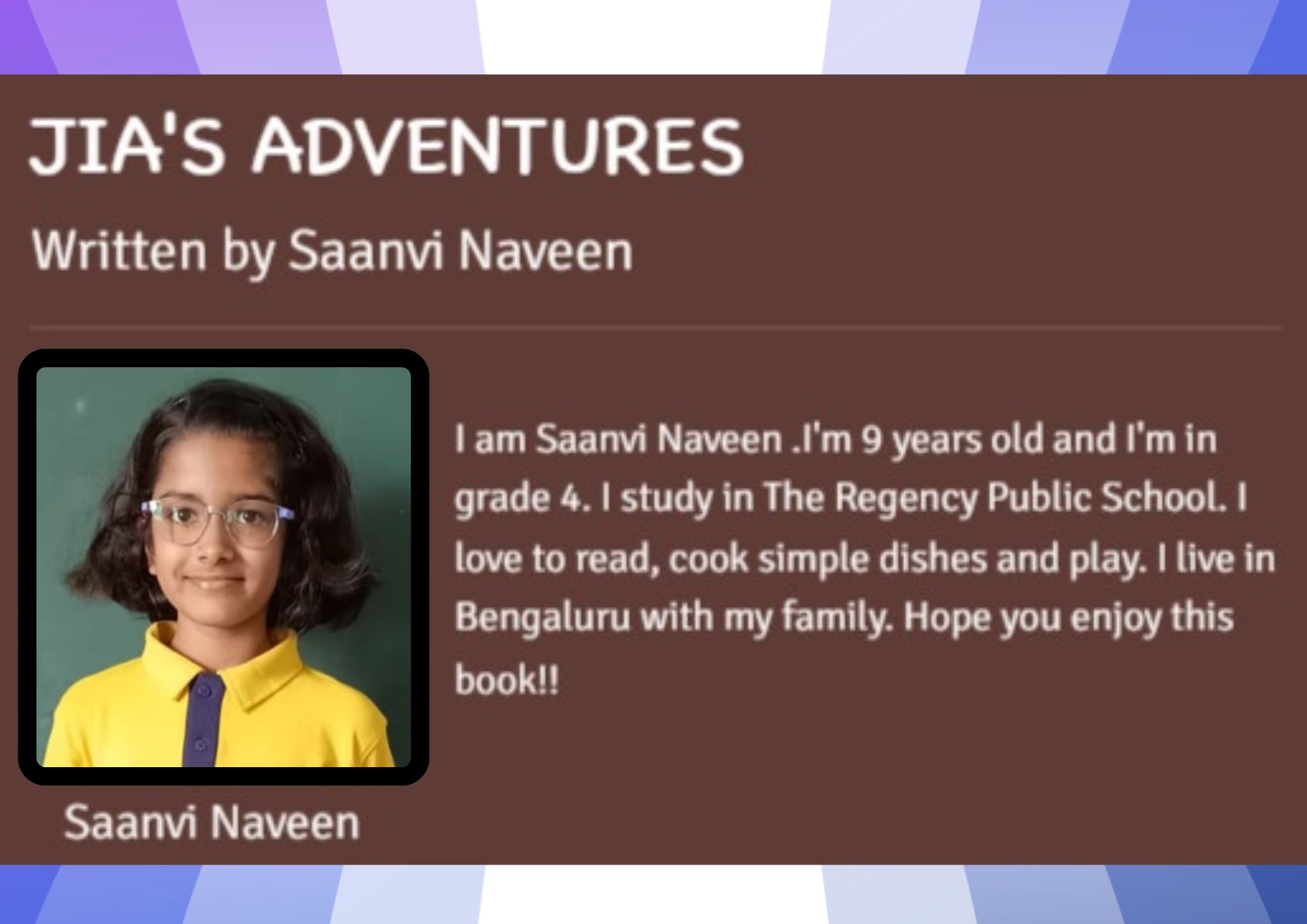 Sakshi Soni of Grade 7 has written a book called My School which is published by BriBooks.Saanvi Naveen, a talented student of Grade 4 from The Regency Public School,who is only 9 years old , has showcased her creativity and passion for writing by authoring a book titled “Jia’s Adventures.”