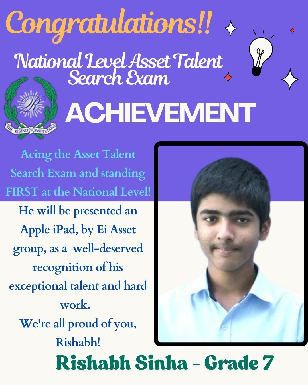 Acing the Asset Talent Search Exam and standing FIRST at the National Level! He will be presented an Apple iPad, by Ei Asset group, as a well-deserved recognition of his exceptional talent and hard work.We're all proud of you, Rishabh!.