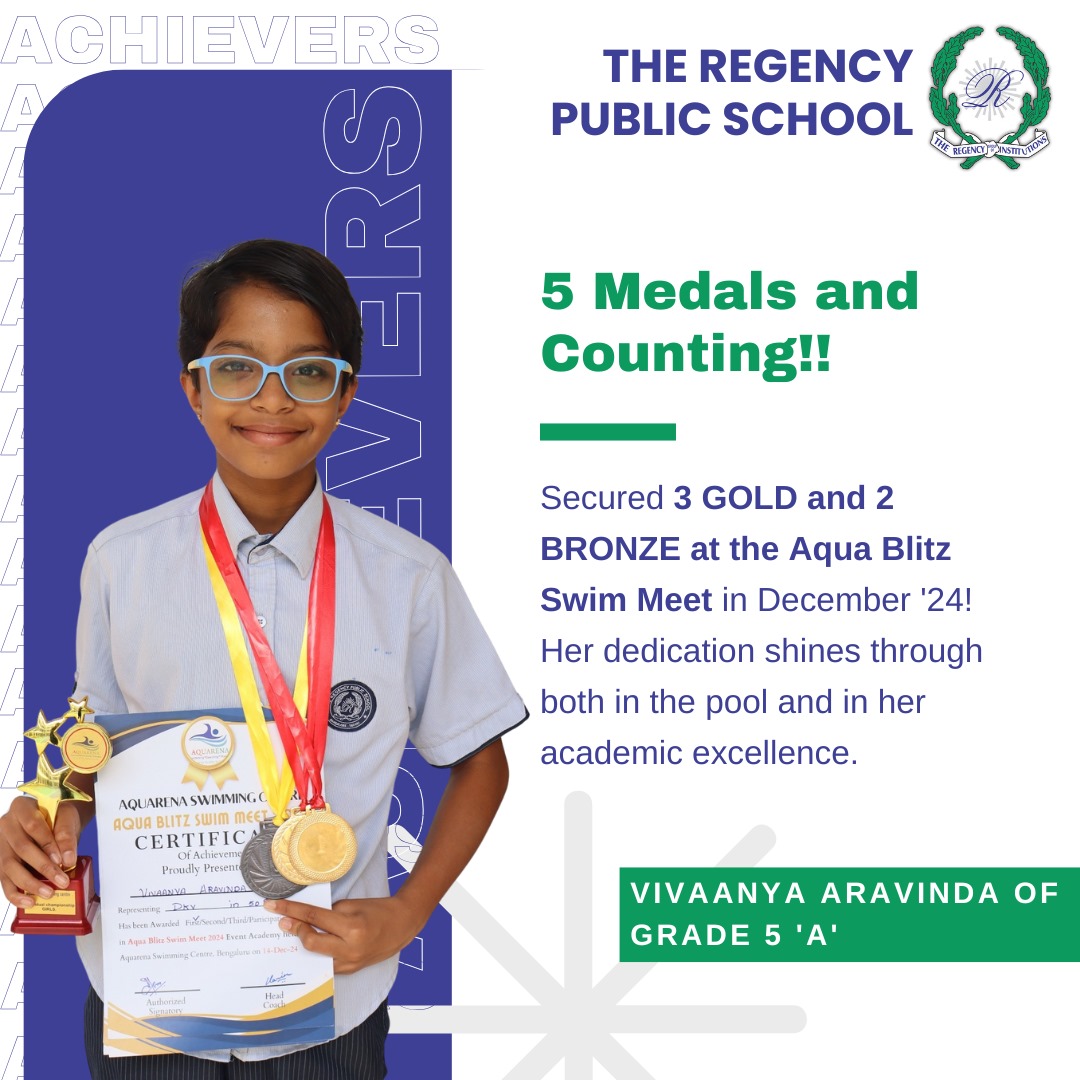 WOW! Vivaanya Aravinda of Grade 5 'A' is a SWIMMING SENSATION! Winning 5 medals, including 3 GOLD and 2 BRONZE, at the Aqua Blitz Swim Meet in December '24 is an OUTSTANDING achievement! Vivaanya sounds like a truly exceptional student! Consistently producing high-quality work requires a tremendous amount of dedication, discipline, and passion for learning.